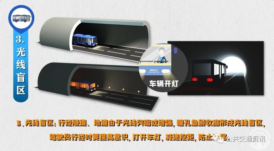3、光線盲區(qū):行經(jīng)隧道、地道由于光線突暗或增強(qiáng),瞳孔急劇收縮形成光線盲區(qū),駕駛員行經(jīng)時(shí)要提高意識(shí),打開車燈,減速控距,防止追尾。