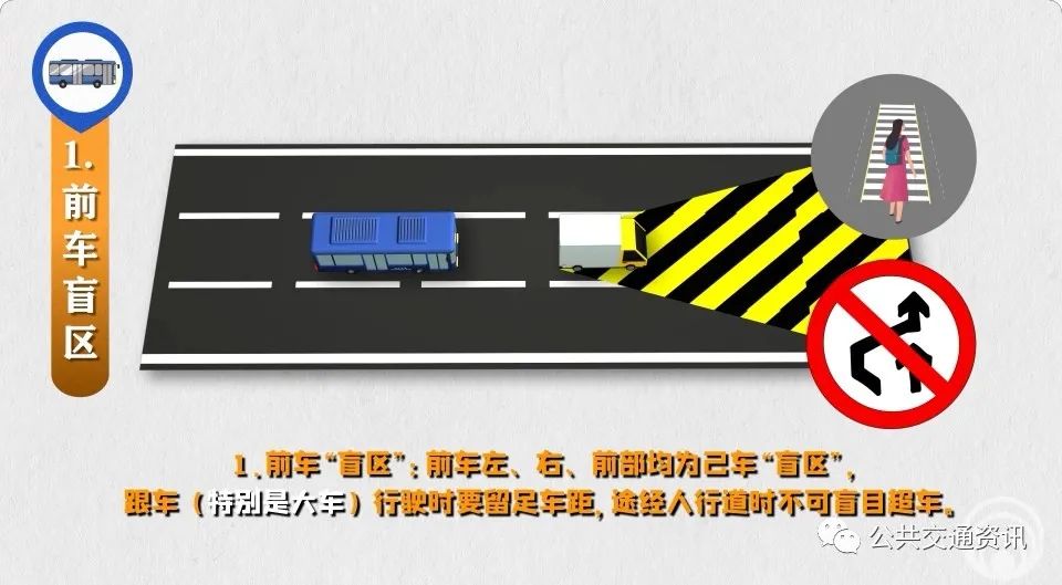 2、旁車“盲區(qū)”:同向車頭、對(duì)向車尾都是己車“盲區(qū)”,駕駛員要做到“同向超車當(dāng)心車頭、對(duì)向會(huì)車當(dāng)心車尾”,防范突然躥出橫穿馬路的行人。