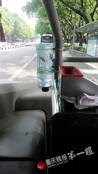 重慶晚報記者從前門上車,一眼就看見門柱上綁一個小號飲料瓶,票箱旁綁著一個大號飲料瓶,瓶子被白色扎帶和膠皮管牢牢系住,瓶口向下,瓶子底部被剪開朝上。大號瓶里有兩條小金魚,正歡快地游著。