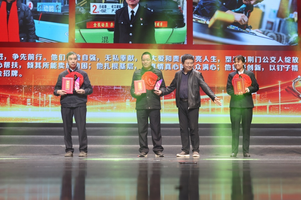 頒獎環(huán)節(jié),在荊門公交發(fā)展歷程中做出過杰出貢獻(xiàn)的8名“時代標(biāo)兵”人物,被授予“崢嶸歲月”“風(fēng)華正茂”“無悔青春”時代標(biāo)兵,感謝他們一路走來的無私付出和拼搏奮斗。
