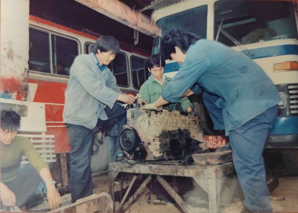 ▲80年代,車間修理工檢修模樣。3個(gè)機(jī)修工一同修理著車輛發(fā)動機(jī),臉上沒有吃力感,更像是帶著興趣在專研。