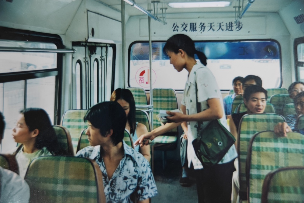 ▲90年代,公交售票員工作模樣??嬷卑种心弥沐X和車票,收錢、找錢、給票、查票行云流水。高峰期數(shù)十人上下車,想要收好票款,無疑是一種考驗(yàn),而她們久經(jīng)考驗(yàn)。