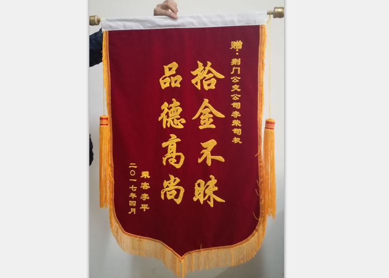 2017年4月4日上午九點左右,一名乘客由于粗心大意,不慎將一個包包遺留在公交車內,包包內裝有蘋果平板電腦一個、手機一部、金銀手飾一包、銀行卡數張、身份證、現金若干.......二公司三路車159#駕駛員李榮在到達運動公園始發(fā)站打掃衛(wèi)生時發(fā)現了一個紅色包包,該駕駛員立馬與隊長取得聯系、剛好隊長和站務在始發(fā)站,駕駛員李榮親自將包交給了隊長,并說明原由,并在眾人下隊長打開了包包,發(fā)現里面的都是貴重物品。不久,失主打包內的電話來詢問此事,隊長認真做了回復,告之為保證物品安全,要攜帶證明按程序認領。當天下午失主李女土從公司支部書記手中認領失物。昨日送來錦旗一面。