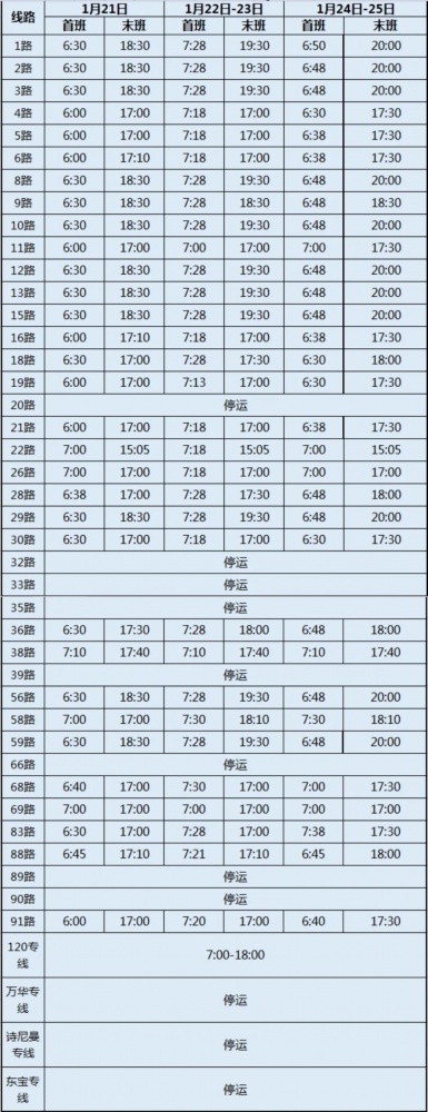 春節(jié)期間,市公交集團公交線路營運計劃有調整。2023年1月21日-1月25日(除夕至初四)各營運線路相較平常在首末班次、發(fā)班間隔上有所變化,為方便廣大市民春節(jié)前后出行,現將春節(jié)期間公交營運安排通告如下: